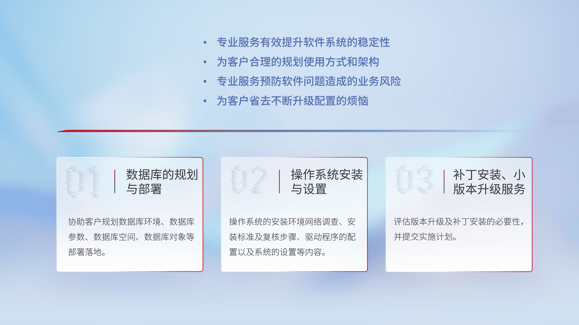 为客户提供软件规模升级、、、快速部署、、按需配置的专业服务,,,从数据库的规划与部署到操作系统的安装与设置,,,再到补丁安装和小版本升级提供支持。。